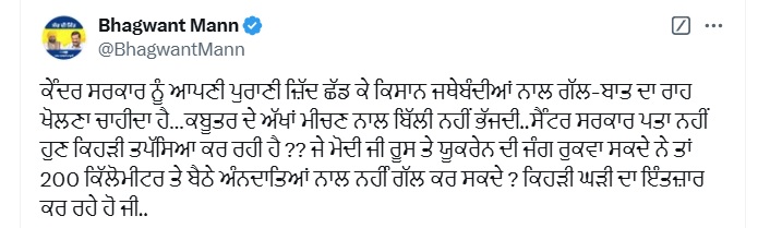 मान ने लिखा है कि कबूतर के आंख बंद करने से बिल्ली नहीं भागती। उन्हें नहीं पता कि केंद्र सरकार अब कौन सी तपस्या कर रही है? अगर प्रधानमंत्री मोदी रूस और यूक्रेन के बीच युद्ध रोक सकते हैं, तो क्या वह 200 किलोमीटर दूर बैठे किसानों से बात नहीं कर सकते? आप किस समय का इंतज़ार कर रहे हो जी?