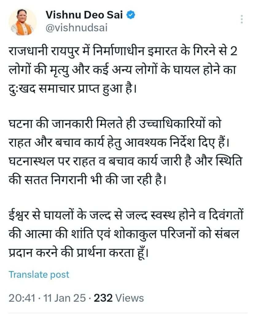 रायपुर. राजधानी के VIP रोड में हुए हादसे को लेकर सीएम साय ने शोक व्यक्त किया है. उन्होंने अपने सोशल मीडिया एक्स पर ट्वीट कर लिखा कि राजधानी रायपुर में निर्माणाधीन इमारत के गिरने से 2 लोगों की मृत्यु और कई अन्य लोगों के घायल होने का दुःखद समाचार प्राप्त हुआ है.