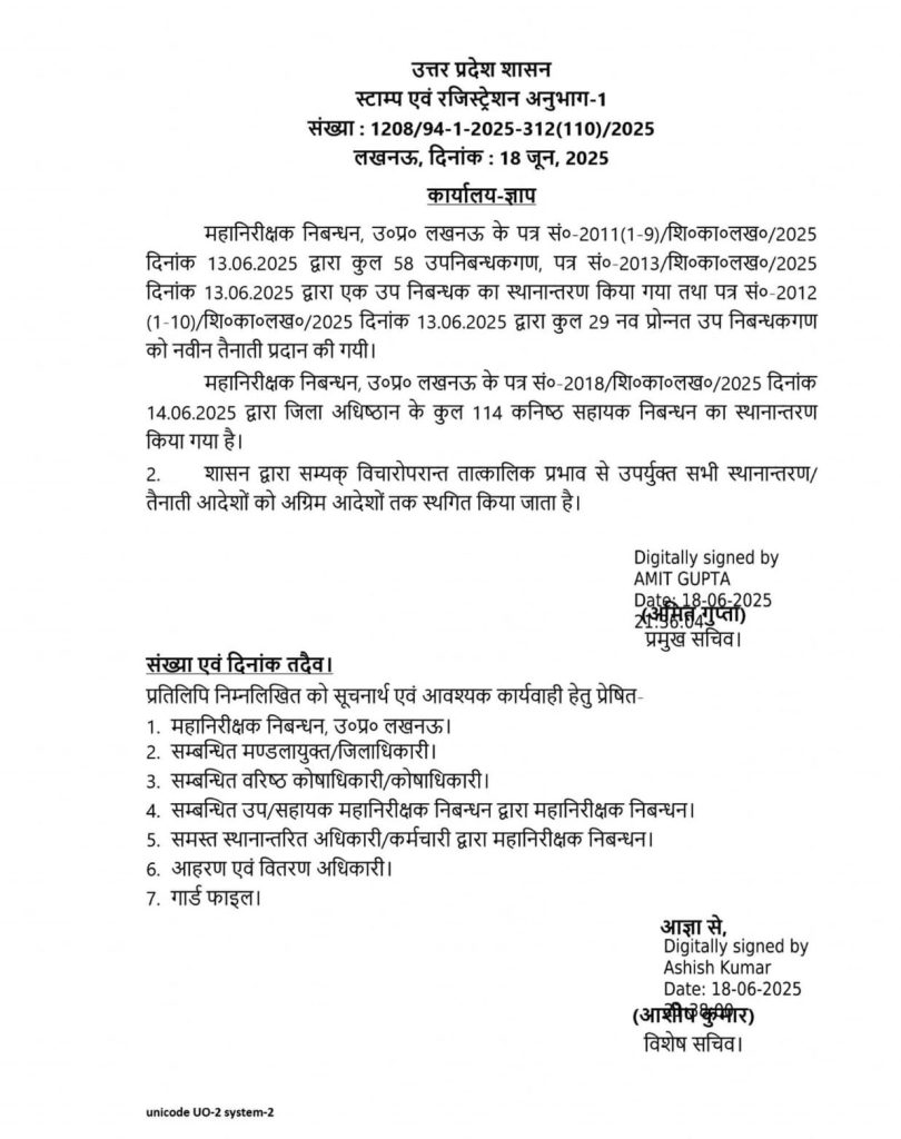 एक आदेश में कहा गया है कि महानिरीक्षक निबन्धन, उ०प्र० लखनऊ के पत्र सं०-2011(1-9)/शि०का०लख०/2025 दिनांक 13.06.2025 द्वारा कुल 58 उपनिबन्धकगण, पत्र सं०-2013/शि०का०लख०/2025 दिनांक 13.06.2025 द्वारा एक उप निबन्धक का स्थानान्तरण किया गया तथा पत्र सं०-2012 (1-10)/शि०का०लख०/2025 दिनांक 13.06.2025 द्वारा कुल 29 नव प्रोन्नत उप निबन्धकगण को नवीन तैनाती प्रदान की गई.