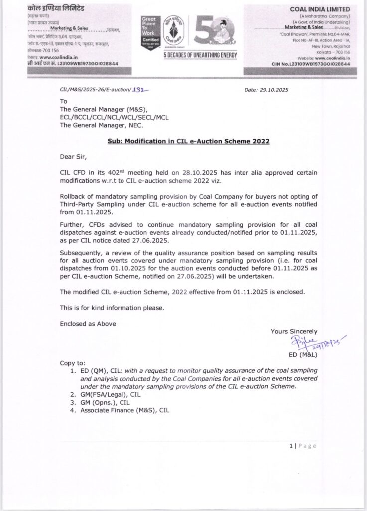 नई दिल्ली। कोल इंडिया लिमिटेड की 402वीं बोर्ड बैठक में कंपनी ने ई-नीलामी योजना 2022 से जुड़े कई अहम संशोधनों को मंजूरी दी है. इसके साथ ही 1 नवंबर 2025 से अधिसूचित सभी ई-नीलामी आयोजनों के लिए कोई खरीदार यदि थर्ड पार्टी सैंपलिंग का विकल्प नहीं चुनता है, तो उस पर कोयला कंपनी की ओर से अनिवार्य सैंपलिंग की शर्त लागू नहीं होगी.