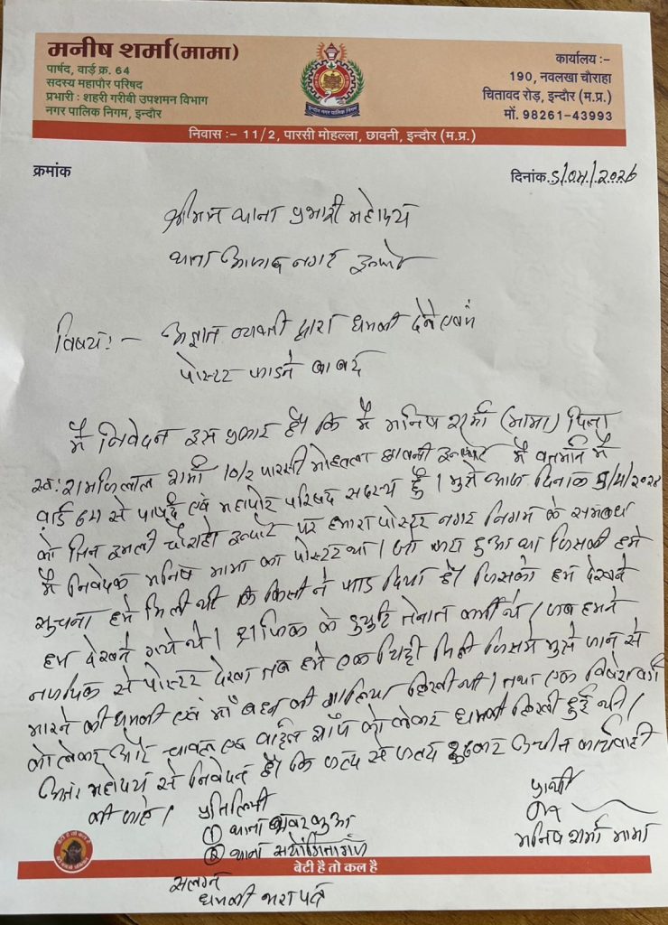 बताया जा रहा है कि अज्ञात व्यक्ति ने तीन इमली चौराहे पर लगे एमआईसी सदस्य के होर्डिंग पोस्टर फाड़ दिए और वहीं एक चिट्ठी छोड़कर उन्हें जान से मारने की धमकी दी। घटना के बाद से इलाके में सनसनी फैल गई है। एक जनप्रतिनिधि को मिली इस तरह की धमकी और शिकायत दर्ज कराने में हुई देरी ने पुलिस व्यवस्था पर कई सवाल खड़े कर दिए हैं। फिलहाल आजाद नगर पुलिस पूरे मामले की जांच में जुटी है और धमकी देने वाले अज्ञात आरोपी की तलाश की जा रही है।