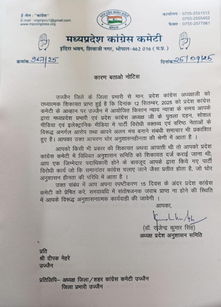 दरअसल अनुशासन समिति के अध्यक्ष राजेंद्र सिंह ने 50 कांग्रेस पदाधिकारी और कार्यकर्ताओं को नोटिस जारी किया है। 15 दिन में नोटिस का जवाब मांगा गया है। नोटिस में कहा गया उज्जैन में समानांतर कांग्रेस चला रहे हैं। नोटिस का जवाब नहीं देने पर अनुशासनहीनता की कार्रवाई होगी।