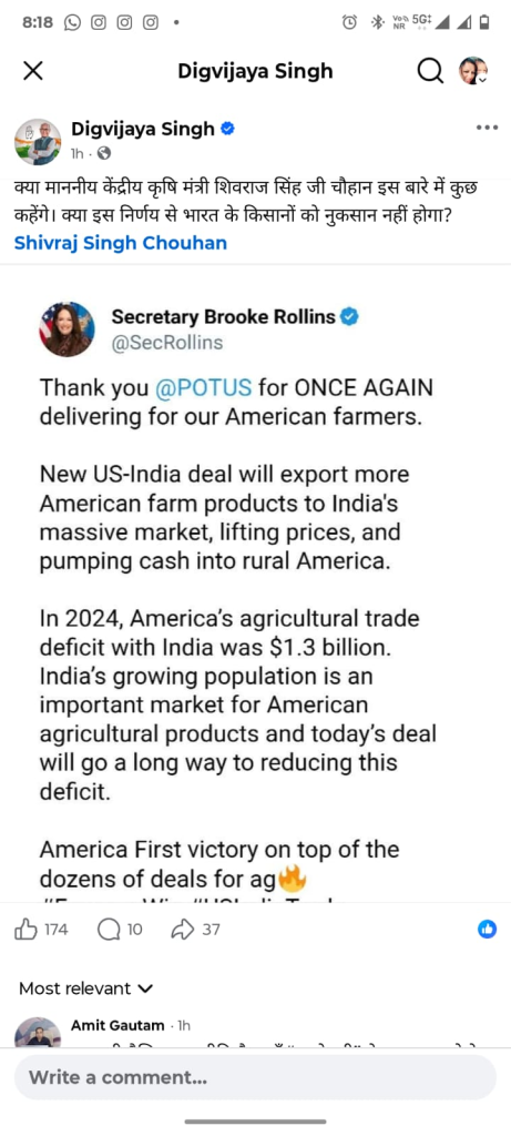 दिग्विजय सिंह ने अमेरिकी कृषि सचिव ब्रुक रोलिंस के एक सोशल मीडिया पोस्ट को शेयर करते हुए लिखा कि रोलिंस ने दावा किया है – “नई US-India डील से अमेरिकी फार्म उत्पाद भारत के विशाल बाजार में ज्यादा निर्यात होंगे, जिससे कीमतें बढ़ेंगी और ग्रामीण अमेरिका में पैसा आएगा।” उन्होंने इसे अमेरिकी किसानों के लिए ‘America First’ जीत बताया है।