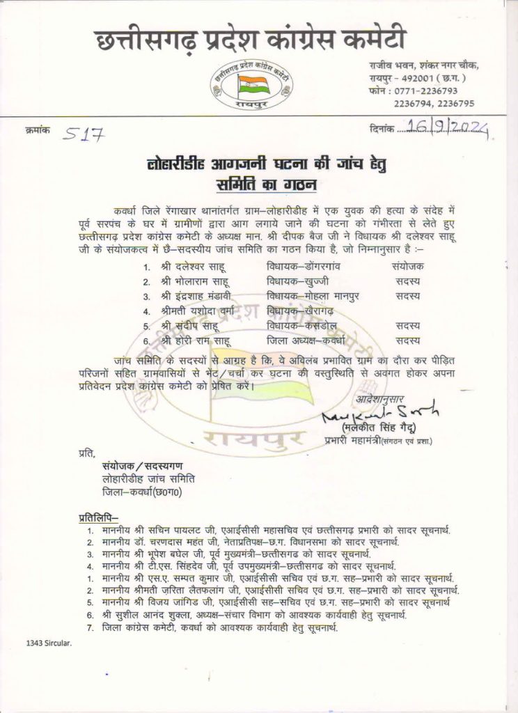 कवर्धा हत्याकांड में कांग्रेस ने बनाई 6 सदस्यीय जांच समिति