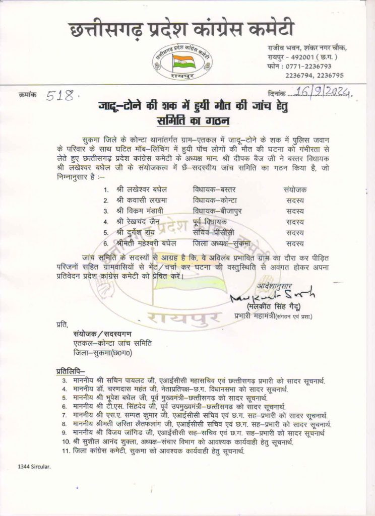 कोंटा में जादू-टोने के शक में 5 लोगों की निर्मम हत्या के मामले कांग्रेस ने 6 सदस्यीय जांच समिति का गठन किया है. समिति में विधायक लखेश्वर बघेल, कवासी लखमा, विक्रम मंडावी, पूर्व विधायक रेखचंद जैन, पीसीसी सचिव दुर्गेश राय और सुकमा जिलाध्यक्ष महेश्वरी बघेल को शामिल किया गया है.