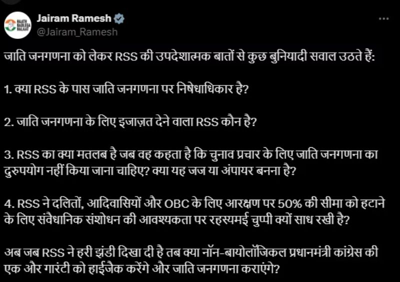 कांग्रेस नेता जयराम रमेश (Jairam Ramesh) ने सोशल मीडिया प्लेटफॉर्म एक्स पर एक पोस्ट के जरिए मोदी सरकार से पांच सवाल पूछे हैं। इन सवालों के जरिए संघ को भी निशाने पर लिया है। जयराम ने पूछा, “जाति जनगणना को लेकर आरएसएस की उपदेशात्मक बातों से कुछ बुनियादी सवाल उठते हैं। क्या आरएसएस के पास जाति जनगणना पर निषेधाधिकार है? जाति जनगणना के लिए इजाजत देने वाला आरएसएस कौन है? आरएसएस का क्या मतलब है जब वह कहता है कि चुनाव प्रचार के लिए जाति जनगणना का दुरुपयोग नहीं किया जाना चाहिए? क्या यह जज या अंपायर बनना है?
