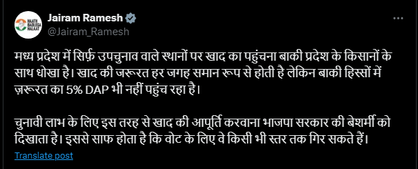 कांग्रेस के महासचिव व वरिष्ठ नेता जयराम रमेश ने मध्य प्रदेश में खाद को लेकर सवाल उठाए हैं। उन्होंने अपने सोशल मीडिया अकाउंट एक्स पर पोस्ट कर लिखा- मध्य प्रदेश में सिर्फ़ उपचुनाव वाले स्थानों पर खाद का पहुंचना बाकी प्रदेश के किसानों के साथ धोखा है। खाद की जरूरत हर जगह समान रूप से होती है लेकिन बाकी हिस्सों में ज़रूरत का 5% DAP भी नहीं पहुंच रहा है। चुनावी लाभ के लिए इस तरह से खाद की आपूर्ति करवाना भाजपा सरकार की बेशर्मी को दिखाता है। इससे साफ होता है कि वोट के लिए वे किसी भी स्तर तक गिर सकते हैं।