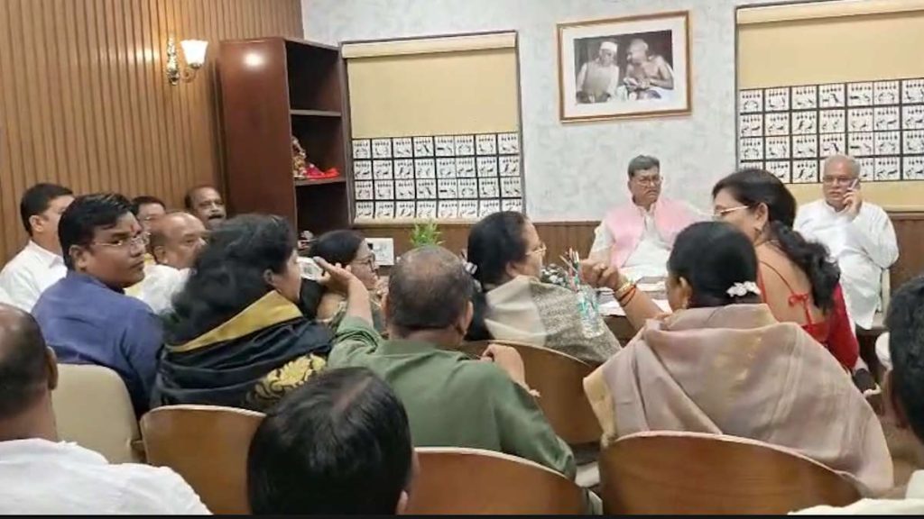 विधानसभा की कार्यवाही का बहिष्कार करने के बाद कांग्रेस विधायकों के साथ नेता-प्रतिपक्ष डॉ. चरण दास महंत ने अपने कक्ष में आपात बैठक शुरू की. इसमें पूर्व मुख्यमंत्री भूपेश बघेल सहित कांग्रेस के तमाम विधायक मौजूद हैं.