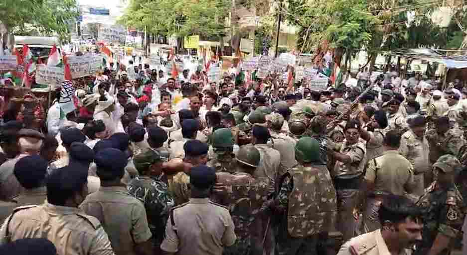 मनेंद्र पटेल, दुर्ग. महात्मा गांधी राष्ट्रीय ग्रामीण रोजगार गारंटी योजना (मनरेगा) में लगातार हो रही कटौती को लेकर कांग्रेस ने आज दुर्ग कलेक्ट्रेट में बड़ा प्रदर्शन किया. बड़ी संख्या में कांग्रेसियों ने सरकार के खिलाफ नारेबाजी करते हुए मनरेगा मजदूरों की आर्थिक स्थिति पर चिंता जताई. पुलिस ने उन्हें कलेक्ट्रेट पहुंचने से रोकने के लिए भारी बैरिकेडिंग और सीमेंट के बड़े-बड़े ब्लॉक लगाए. इस दौरान कांग्रेस कार्यकर्ताओं और पुलिस के बीच जमकर धक्का-मुक्की भी हुई.