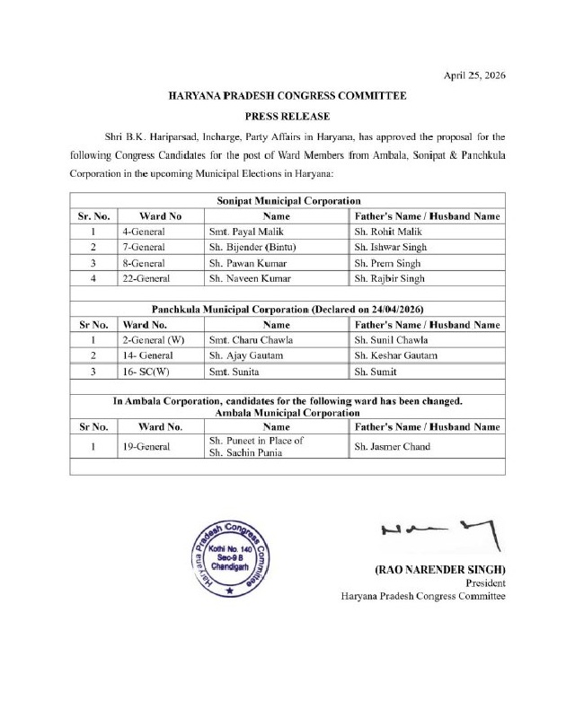 पंचकुला। हरियाणा कांग्रेस ने निकाय चुनावों के लिए अपनी रणनीति साफ करते हुए अंबाला, सोनीपत और पंचकूला नगर निगमों के लिए उम्मीदवारों के नामों पर अंतिम मुहर लगा दी है। पार्टी के प्रदेश प्रभारी बी.के. हरिप्रसाद ने वार्ड सदस्यों के चयन को हरी झंडी दे दी है जिसके बाद प्रदेश अध्यक्ष राव नरेंद्र सिंह ने आधिकारिक सूची जारी की। सोनीपत में चार महत्वपूर्ण सीटों पर नामों का ऐलान हुआ है जिनमें वार्ड चार से पायल मलिक, वार्ड सात से बिजेन्द्र बिंटू, वार्ड आठ से पवन कुमार और वार्ड बाईस से नवीन कुमार को चुनावी मैदान में उतारा गया है।