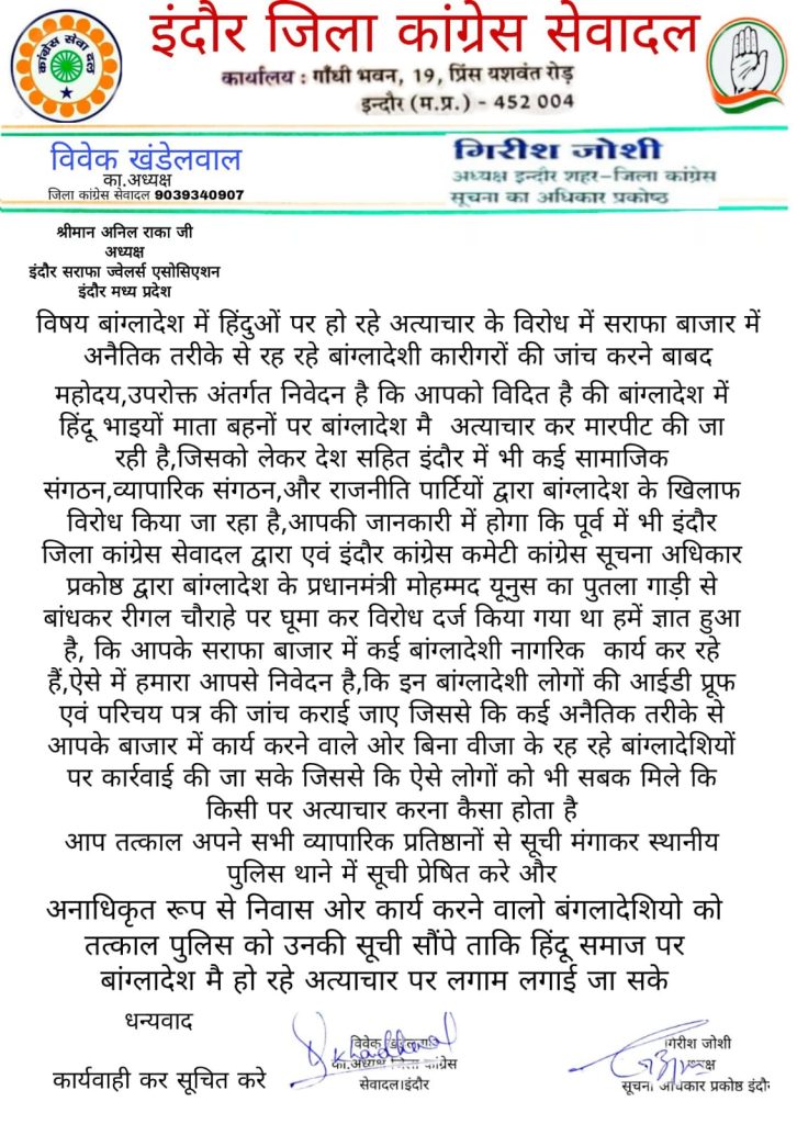 कांग्रेस सेवा दल ने इंदौर सराफा एसोसिएशन को पत्र लिखा है। जिसमें बांग्लादेश में हिंदुओं पर हो रहे अत्याचार के विरोध में सराफा बाजार में अनैतिक तरीके से रह रहे बांग्लादेशी कारीगरों की जांच की मांग की है। साथ ही कांग्रेस सेवा दल ने निवेदन किया है कि अनाधिकृत रूप से काम करने वाले बांग्लादेशियों की सूची पुलिस को सौंपे। ताकि बांग्लादेश में हिंदू समाज पर हो रहे अत्याचार पर लगाम लगाई जा सके।