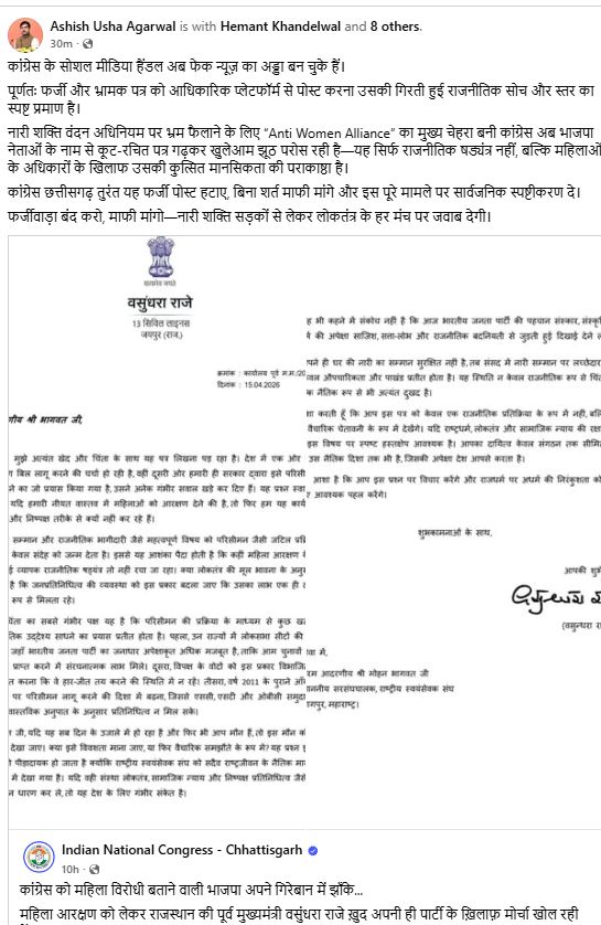 कांग्रेस छत्तीसगढ़ तुरंत यह फर्जी पोस्ट हटाए, बिना शर्त माफी मांगे और इस पूरे मामले पर सार्वजनिक स्पष्टीकरण दे।फर्जीवाड़ा बंद करो, माफी मांगो-नारी शक्ति सड़कों से लेकर लोकतंत्र के हर मंच पर जवाब देगी।