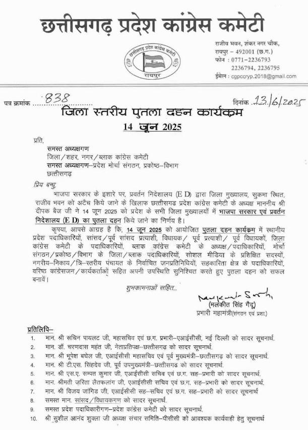 छत्तीसगढ़ प्रदेश कांग्रेस कमेटी के अध्यक्ष दीपक बैज ने पुतला दहन कार्यक्रम में स्थानीय प्रदेश पदाधिकारियों, सांसद-पूर्व सांसद प्रत्याशी, विधायक, प्रत्याशी-पूर्व विधायकों, जिला और ब्लॉक कांग्रेस कमेटी के पदाधिकारियों और तमाम कार्यकर्ताओं से शामिल होने की अपील की है.