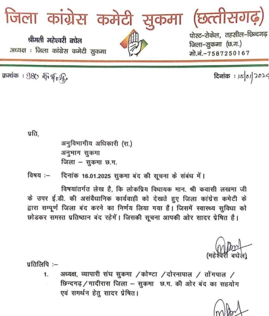 सुकमा. शराब घोटाला मामले में पूर्व आबकारी मंत्री, कोंटा विधायक कवासी लखमा की गिरफ्तारी के विरोध में जिला कांग्रेस कमेटी ने 16 जनवरी को सुकमा बंद का ऐलान किया है. इसकी सूचना सुकमा जिला कांग्रेस कमेटी ने अनुविभागीय अधिकारी को दे दी है.