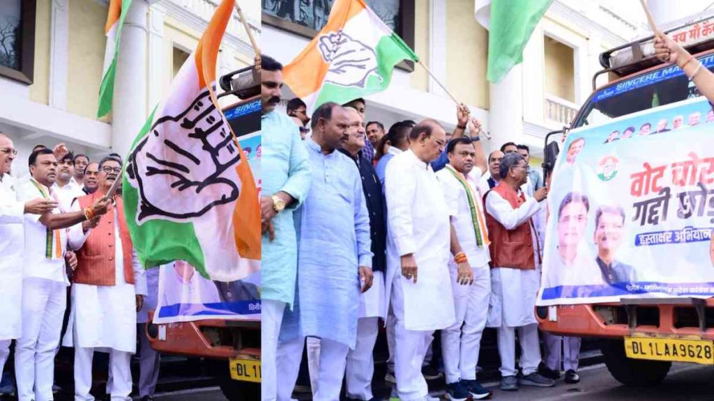 सुप्रिया पांडेय, रायपुर. वोट चोर गद्दी छोड़ अभियान के तहत कांग्रेस ने छत्तीसगढ़ में हस्ताक्षर अभियान चलाया. प्रदेशभर से करीब साढ़े 15 लाख से अधिक हस्ताक्षर फॉर्म एकत्र हुआ है, जिसे दिल्ली भेजा गया. पीसीसी चीफ दीपक बैज, नेता प्रतिपक्ष चरण दास महंत ने वाहन को हरी झंडी दिखाकर सभी हस्ताक्षर फाॅर्मों को दिल्ली के लिए रवाना किया.