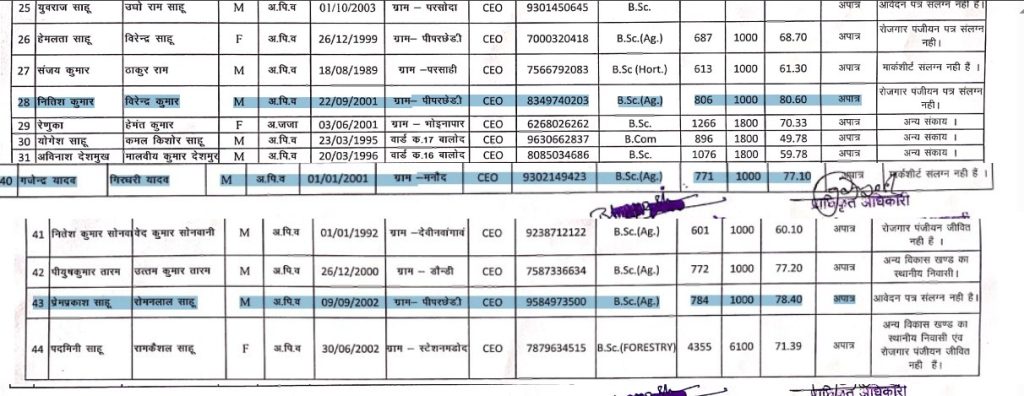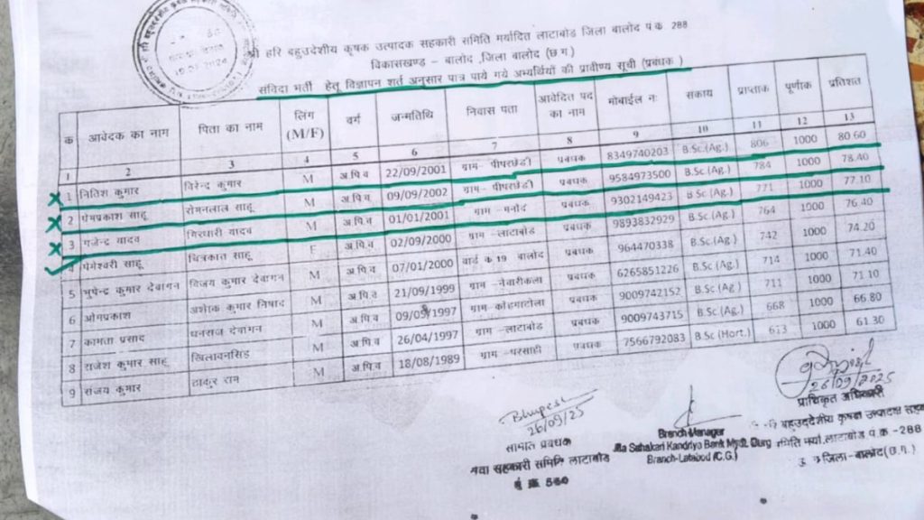 लक्ष्मीकांत बंसोड़, बालोद। जिले के लाटाबोड़ स्थित श्री हरि बहुद्देश्यीय कृषक उत्पादक सहकारी समिति मर्यादित द्वारा सविदा भर्ती प्रक्रिया में गड़बड़ी उजागर हुई है। 3 जुलाई 2025 को दो पदों के लिए विज्ञापन जारी करने के बाद, सूची में अपात्र लोगों के नाम न सिर्फ पात्र किया गया बल्कि उनका नाम प्रवीण सूची में शामिल कर लाभ पहुंचाने का काम किया गया, जिससे बेरोजगारों में आक्रोश फैल गया है।
