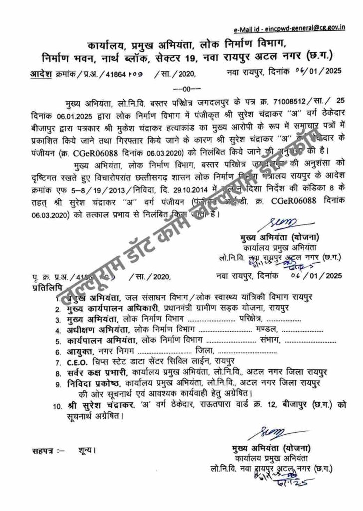 लोक निर्माण विभाग की ओर से सोमवार को जारी आदेश में बताया गया कि मुख्य अभियंता, बस्तर परिक्षेत्र जगदलपुर ने विभाग में पंजीकृत “अ” वर्ग ठेकेदार सुरेश चंद्राकर के पत्रकार मुकेश चंद्राकर हत्याकांड का मुख्य आरोपी के रूप में गिरफ्तार किए जाने पर पंजीयन को निलंबित किए जाने की अनुशंसा की थी. इस अनुशंसा को ध्यान में रखते हुए मंत्रालय ने सुरेश चंद्राकर के “अ” वर्ग पंजीयन को तत्काल प्रभाव से निलंबित कर दिया है.