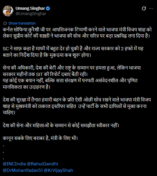 सुप्रीम कोर्ट के आदेश की तारीफ करते हुए उमंग सिंघार ने भाजपा और मंत्री विजय शाह को घेरा है। उन्होंने सोशल मीडिया प्लेटफॉर्म एक्स पर लिखा, ‘कर्नल सोफिया कुरैशी जी पर आपत्तिजनक टिप्पणी करने वाले भाजपा मंत्री विजय शाह को लेकर सुप्रीम कोर्ट की सख़्ती ने भाजपा की सोच और चरित्र पर बड़ा प्रश्नचिह्न लगा दिया है।SC ने साफ कहा है माफी में बहुत देर हो चुकी है और राज्य सरकार को 2 हफ्ते में यह बताने का निर्देश दिया है कि मुकदमा कब शुरू होगा।’