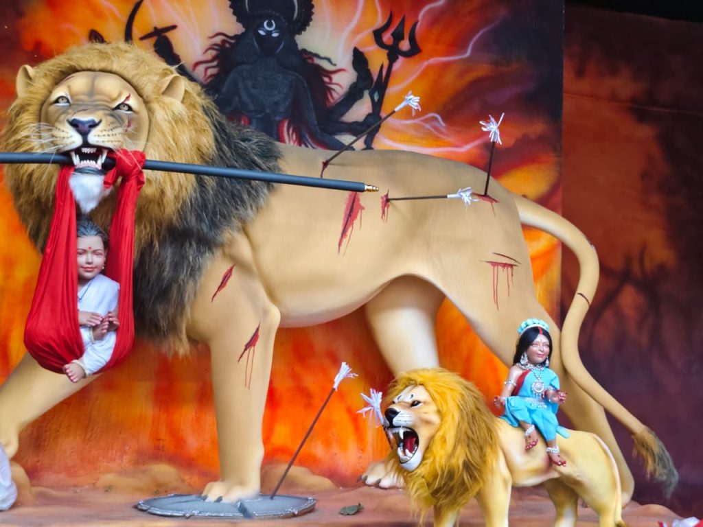 रायपुर। शारदीय नवरात्रि के पहले दिन राजधानी रायपुर में माता की प्रतिमाओं को लेकर विवाद गहरा गया है. लोधीपारा में स्थापित माता की प्रतिमा, जो ‘बेटी बचाओ, बेटी पढ़ाओ’ थीम पर आधारित है, को लेकर स्थानीय लोगों और विश्व हिंदू संगठनों के बीच तनाव बढ़ गया है. इस प्रतिमा में माता की सवारी शेर को अपने मुंह में एक बच्ची को बचाते हुए और स्वयं चोटिल अवस्था में दर्शाया गया है, जिसका कुछ संगठनों ने विरोध किया.