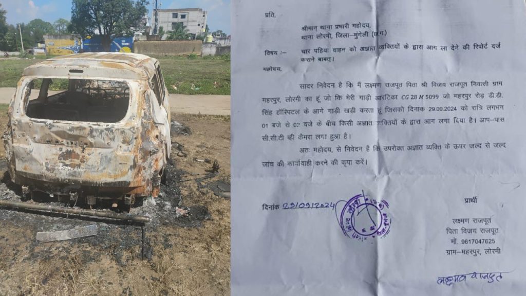 लोरमी थाना क्षेत्र के महरपुर में रहने वाले लक्ष्मण राजपूत की अर्टिका वाहन को अज्ञात आरोपी ने आग के हवाले कर दिया। यह घटना एक रात पहले की है जब लक्ष्मण ने अपने वाहन को महरपुर रोड पर डॉ. डी.डी. सिंह के अस्पताल के सामने खड़ा किया था। सुबह जब उन्हें सूचना मिली कि उनका चार पहिया वाहन जल चुका है, तो उन्होंने आसपास लगे सीसीटीवी कैमरों की जांच की। कैमरे में एक संदिग्ध व्यक्ति मोटरसाइकिल पर आते-जाते दिखाई दे रहा है।