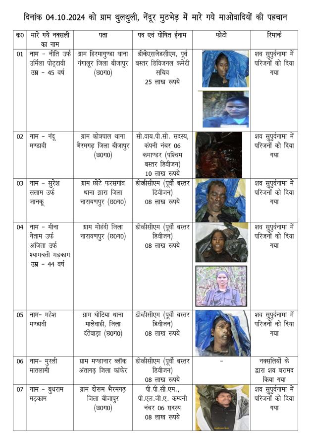 आशुतोष तिवारी, जगदलपुर. 4 अक्टूबर को दंतेवाड़ा-नारायणपुर के नेंदूर-थुलथुली के जंगल में हुई मुठभेड़ में मारे गए सभी 38 माओवादियों की पहचान कर ली गई है. इन 38 माओवादियों पर कुल 2 करोड़ 62 लाख रुपये का इनाम घोषित है. दंतेवाड़ा पुलिस अधीक्षक गौरव राय और नारायणपुर पुलिस अधीक्षक प्रभात कुमार ने सूची जारी करते हुए बताया कि मुठभेड़ में मारे गए माओवादियों में 01 डीकेएसजेडसी, 01 सी.वाय.पी.सी. कमांडर, 03 डीवीसीएम, 14 पीएलजीए कंपनी नंबर 06 के सदस्य, 02 डीकेएसजेडसी गार्ड और 06 एरिया कमिटी सदस्य शामिल हैं.