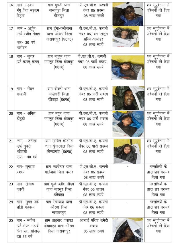 बस्तर पुलिस से मिली के अनुसार, मुठभेड़ में मारे गये सभी 38 माओवादियों पर कुल 2.62 करोड़ का ईनाम घोषित है, जिन पर जिला दन्तेवाड़ा, नारायणपुर, कोण्डागांव, बस्तर में कुल 250 से अधिक अपराध पंजीबंद्व हैं. इन माओवादियों पर पुलिस-नक्सली मुठभेड़ 61, कैम्प अटैक 11, आईईडी ब्लास्ट 17, आगजनी 09, पोलिंग बूध पर हमला 03 जैसे गंभीर अपराध पंजीबद्धी हैं. इन घटनाओं में कुल 26 आम नागरिक घायल, 23 आम नागरिको की हत्या, 15 पुलिस जवान घायल व 28 पुलिस जवान शहीद हुए हैं.