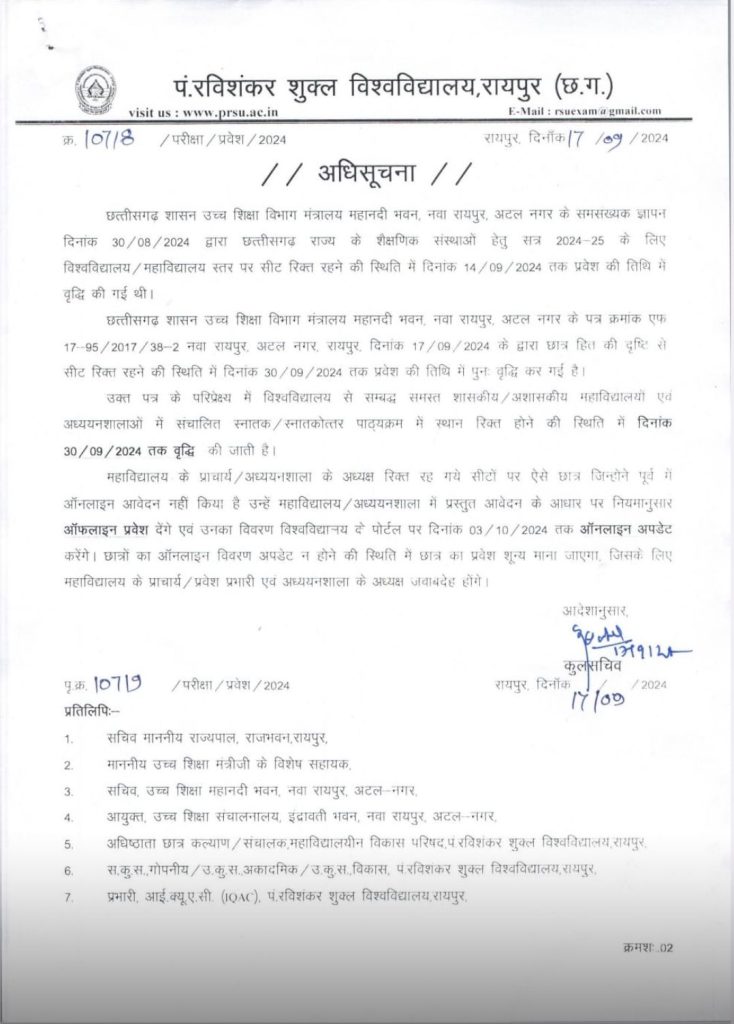 सत्या राजपूत, रायपुर. पंडित रविशंकर शुक्ल विश्वविद्यालय की तरफ से संबद्ध कॉलेजों में प्रवेश की तिथि को बढ़ाकर 30 सितंबर कर दिया है. छात्र हित में फैसला लेते हुए विश्वविद्यालय ने प्रवेश के लिए तारिख को बढ़ा दिया है. जिसके बाद अब छात्र पंडित रविशंकर विश्वविद्यालय में प्रवेश ले सकते हैं. इसके लिए पंडित रविशंकर शुक्ल विश्वविद्यालय की ओर से अधिसूचना जारी कर दी गई है.