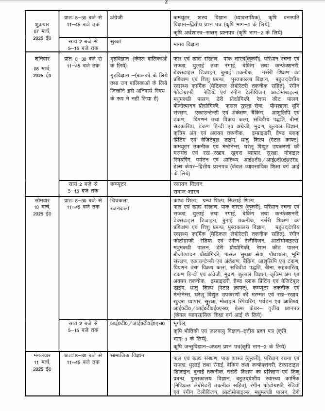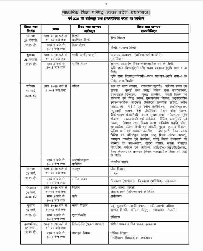 लखनऊ । उत्तरप्रदेश माध्यमिक शिक्षा विभाग ने परीक्षा शेड्यूल जारी कर दिया है। यूपी बोर्ड की 10वीं और 12वीं की परीक्षा 24 फरवरी से 12 मार्च 2025 तक आयोजित की जाएगी। यूपी बोर्ड हाईस्कूल और इंटरमीडिएट की परीक्षा 2025 में कुल 54,38,597 परीक्षार्थी शामिल होंगे।