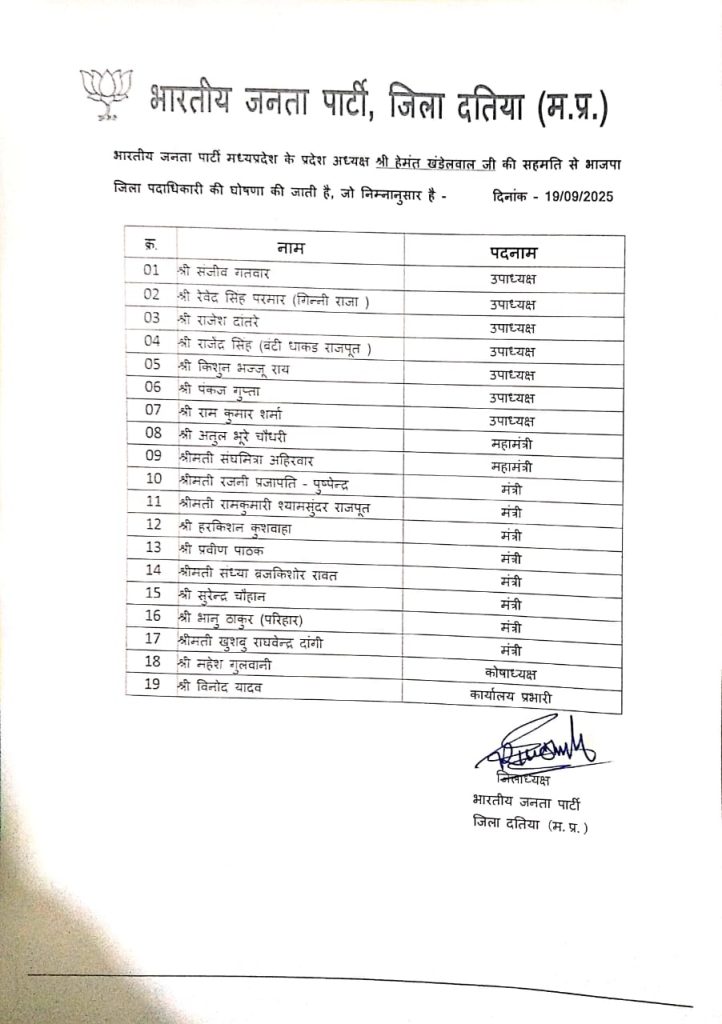 बीजेपी प्रदेश अध्यक्ष हेमंत खंडेलवाल की सहमति के बाद दतिया जिला कार्यकारिणी की सूची जारी कर दी गई है। संगठन ने 7 उपाध्यक्ष, 2 महामंत्री, 8 मंत्री, कोषाध्यक्ष और कार्यालय मंत्री का ऐलान किया है।