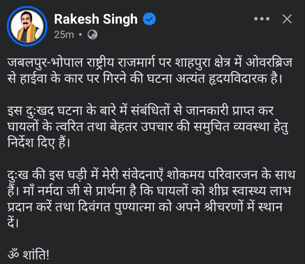 भीषण हादसे पर लोक निर्माण मंत्री राकेश सिंह ने गहरा दुख जताया है। उन्होंने कहा—’यह घटना अत्यंत हृदयविदारक है। घायलों के तत्काल और बेहतर इलाज के निर्देश दिए गए हैं। दुःख की इस घड़ी में परिवार के साथ मेरी संवेदनाएं हैं। माँ नर्मदा जी से प्रार्थना है कि घायलों को शीघ्र स्वास्थ्य लाभ मिले और दिवंगत पुण्यात्माओं को श्रीचरणों में स्थान मिले।'”