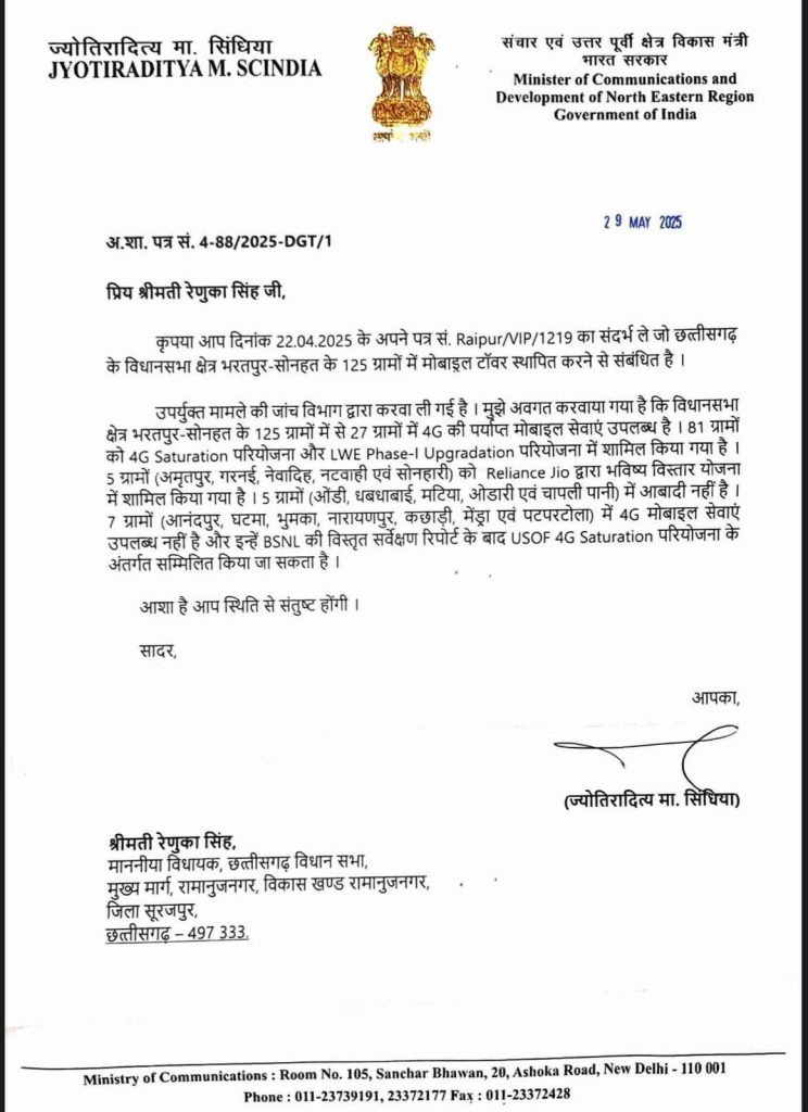 विधायक रेणुका सिंह द्वारा अपने क्षेत्र में नेटवर्क की गंभीर समस्याओं को उठाए जाने के बाद केंद्रीय संचार मंत्री ने तत्काल दूरसंचार विभाग को सर्वेक्षण के निर्देश दिए। सर्वेक्षण के आधार पर भरतपुर-सोनहत क्षेत्र के 83 गांवों को 4G सैचुरेशन योजना और LWE Phase-1 Upgradation परियोजना में शामिल कर लिया गया है।