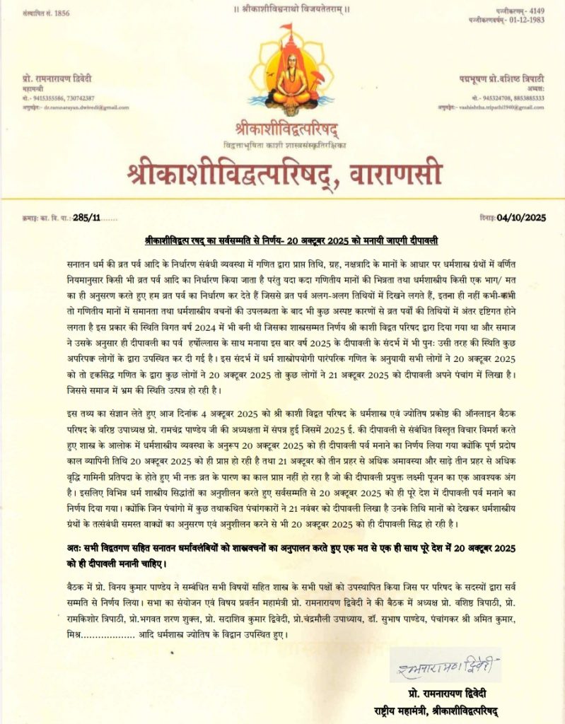 Diwali 2025 Date, वाराणसी. दीपावली की तिथि को लेकर जो संशय था उस पर श्रीकाशी विद्वत परिषद ने खत्म कर दिया है. श्रीकाशी विद्वत परिषद ने तिथि विवाद पर स्पष्ट निर्णय देते हुए तिथि निश्चित कर दी है. जिसके अनुसार इस बार दीपावली 20 अक्टूबर को मनाई जाएगी. श्रीकाशी विद्वत परिषद ने इसकी घोषणा कर दी है. राष्ट्रीय कार्यकारिणी की ऑनलाइन बैठक में तिथि पर सहमति बन गई है.