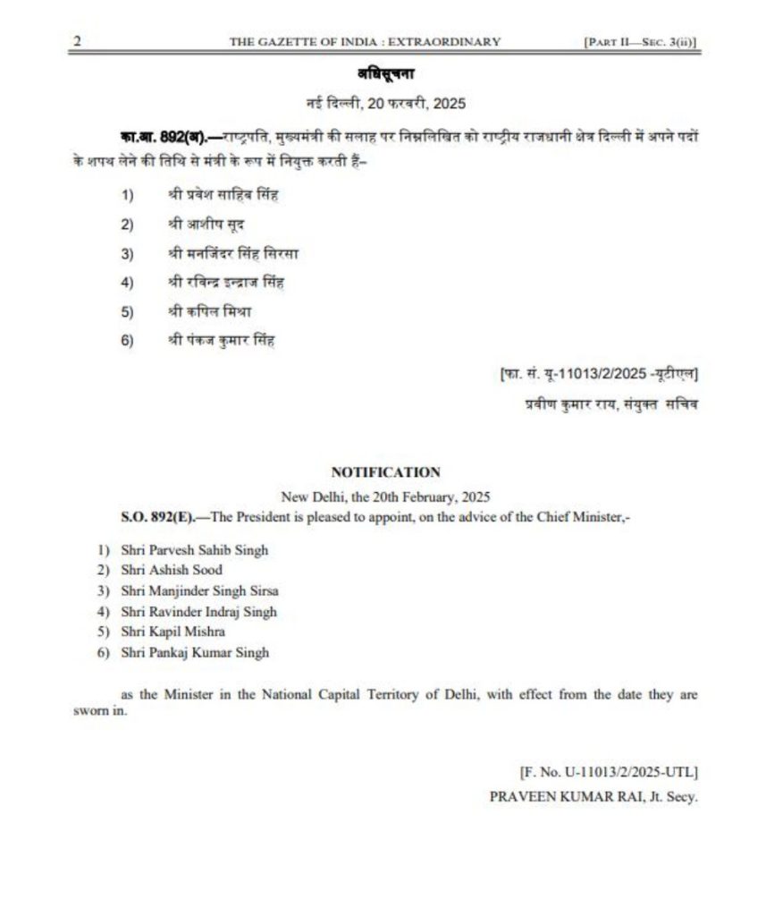 रेखा गुप्ता की कैबिनेट में प्रवेश वर्मा, मनजिंदर सिंह सिरसा, रवींद्र इंद्रराज, कपिल मिश्रा, आशीष सूद और पंकज सिंह मंत्री पद की शपथ लेंगे। बीजेपी ने दिल्ली के सीएम पद के लिए महिला और वैश्य फैक्टर को ध्यान में रखा है। वहीं मंत्रिमंडल के गठन में पूर्वांचल, पंजाबी, ब्राह्मण और दलित चेहरों को ध्यान में रखा गया है।