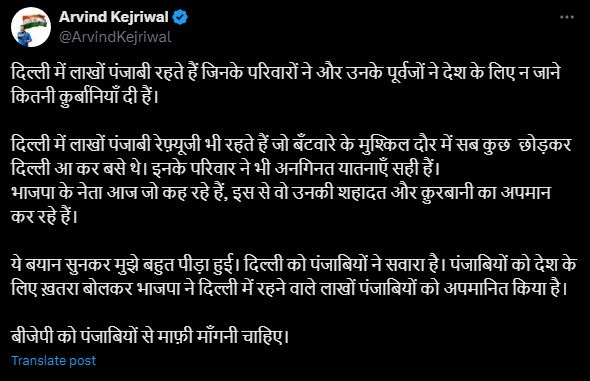 दिल्ली के पूर्व सीएम व AAP के राष्ट्रीय संयोजक ने कहा कि ‘दिल्ली में लाखों पंजाबी रहते हैं जिनके परिवारों ने और उनके पूर्वजों ने देश के लिए न जाने कितनी कुर्बानियां दी हैं। दिल्ली में लाखों पंजाबी रेफ्यूजी भी रहते हैं जो बंटवारे के मुश्किल दौर में सब कुछ छोड़कर दिल्ली आ कर बसे थे। इनके परिवार ने भी अनगिनत यातनाएं सही हैं। भाजपा के नेता आज जो कह रहे हैं, इस से वो उनकी शहादत और कुरबानी का अपमान कर रहे हैं। यह बयान सुनकर मुझे बहुत पीड़ा हुई। दिल्ली को पंजाबियों ने सवारा है। पंजाबियों को देश के लिए खतरा बोलकर भाजपा ने दिल्ली में रहने वाले लाखों पंजाबियों को अपमानित किया है। बीजेपी को पंजाबियों से माफी मांगनी चाहिए।’