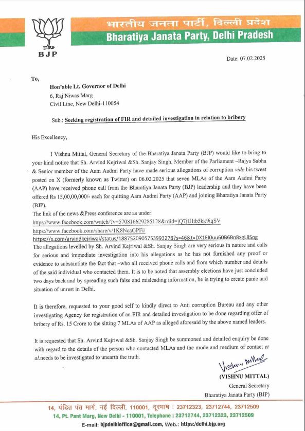 BJP ने LG को पत्र लिखकर की थी शिकायत
