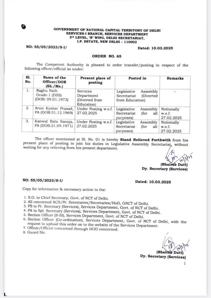 1. रघुनाथ (ग्रेड-1, DSS) – पहले ये सेवा विभाग में कार्यरत थे, अब इनकी नियुक्ति दिल्ली विधानसभा सचिवालय में की गई है.