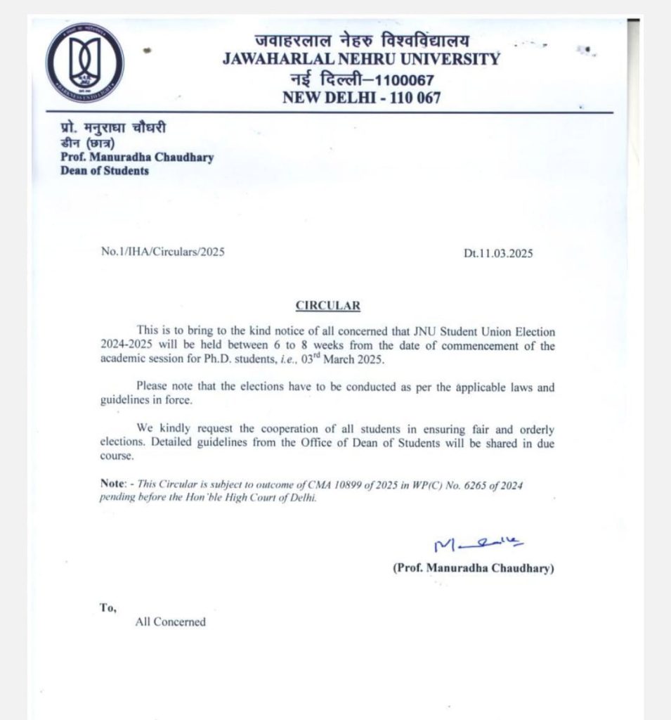 जवाहरलाल नेहरू विश्वविद्यालय (JNU) प्रशासन ने छात्रसंघ चुनावों के संबंध में आधिकारिक सूचना जारी की है. इस सर्कुलर के अनुसार, चुनाव अकादमिक सत्र की शुरुआत के छह से आठ सप्ताह के भीतर होंगे. संभावना है कि ये चुनाव अप्रैल के अंत या मई की शुरुआत में संपन्न होंगे. जेएनयू प्रशासन ने सर्कुलर में यह भी स्पष्ट किया है कि चुनावों का आयोजन मौजूदा कानूनों और दिशा-निर्देशों के अनुसार किया जाएगा. छात्रों से अनुरोध किया गया है कि वे चुनाव प्रक्रिया को व्यवस्थित और निष्पक्ष बनाए रखने में सहयोग करें.