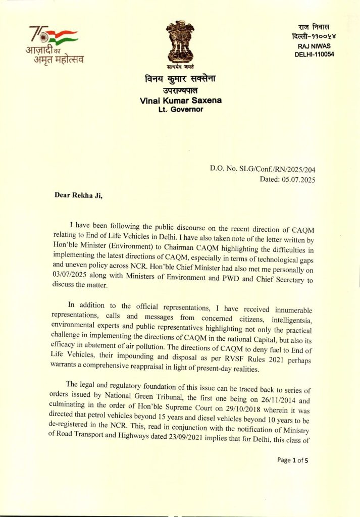 एलजी ने अपने पत्र में लिखा है कि “यह फैसला सामाजिक और आर्थिक दृष्टि से उचित नहीं है। मध्यम वर्ग अपनी जीवनभर की कमाई से गाड़ी खरीदता है। ऐसी गाड़ियों को अचानक ‘अमान्य’ घोषित करना व्यवहारिक नहीं है। एलजी ने इस आदेश को स्थगित रखने के लिए कहा है।