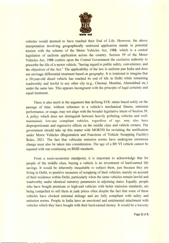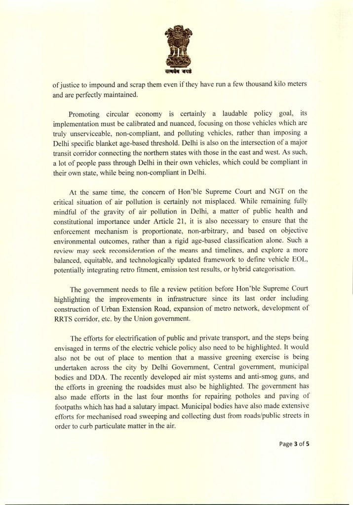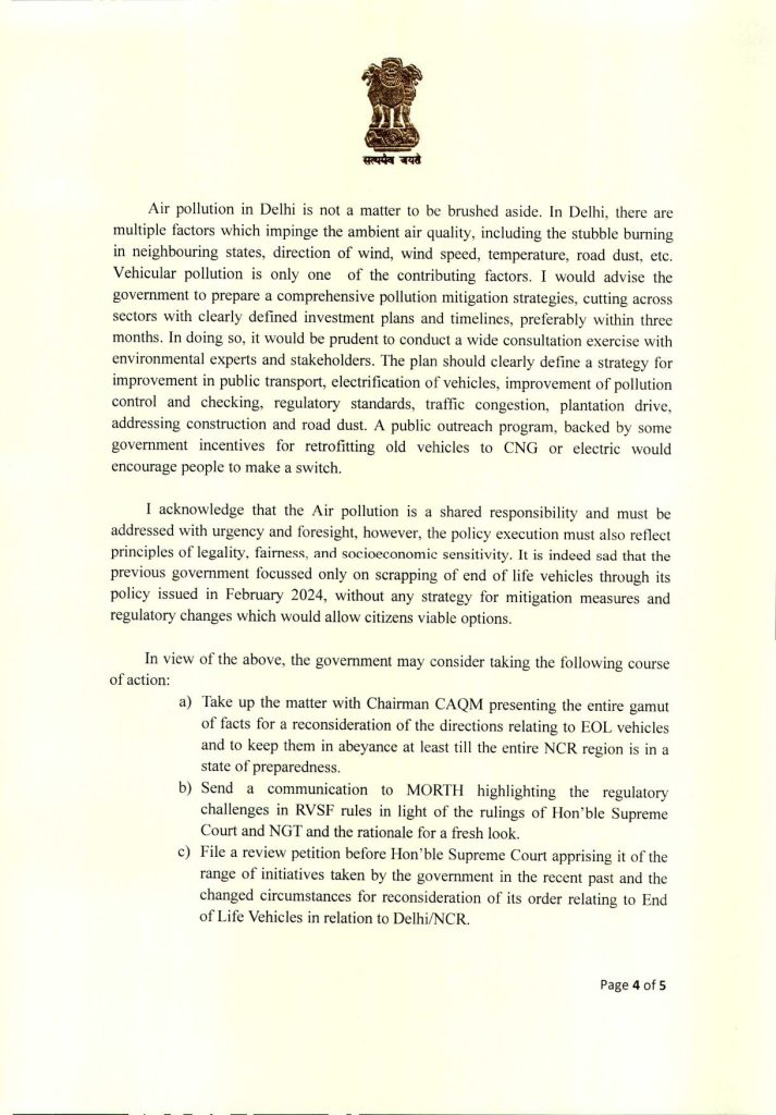 उन्होंने मुख्यमंत्री से आग्रह किया है कि सुप्रीम कोर्ट के 2018 के उस आदेश की समीक्षा के लिए पुनः याचिका दायर की जाए जिसमें इन वाहनों को डी-रजिस्टर करने की बात कही गई थी। इसके साथ ही CAQM के अध्यक्ष से इस दिशा-निर्देश के अमल को स्थगित करने का भी अनुरोध करने को कहा है। एलजी ने यह भी बताया कि उन्हें इस फैसले के खिलाफ हजारों नागरिकों, विशेषज्ञों और जनप्रतिनिधियों से प्रतिक्रिया मिली है, जिनका मानना है कि यह नीति ग्राउंड लेवल पर लागू नहीं की जा सकती और इसका वायु प्रदूषण को नियंत्रित करने में प्रभावी योगदान संदिग्ध है।