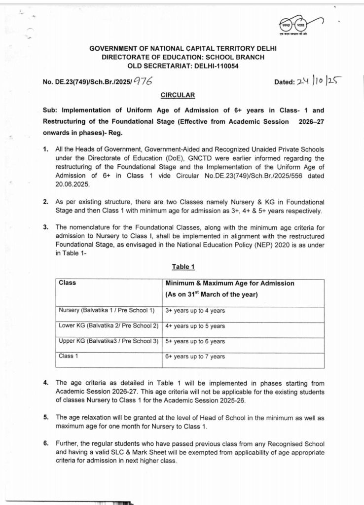 Delhi School Admission Rules Change: दिल्ली में स्कूल एडमिशन का नियम बदल गया है। जी हां…दिल्ली सरकार ने सरकारी स्कूलों में एडमिशन प्रक्रिया को लेकर एक अहम फैसला लिया है। शिक्षा निदेशालय ने शैक्षणिक सत्र 2026-27 से लागू होने वाले नए नियम जारी किया है। अब कक्षा 1 में दाखिले के लिए बच्चे की न्यूनतम उम्र 6 साल और अधिकतम उम्र 7 साल तय की गई है।