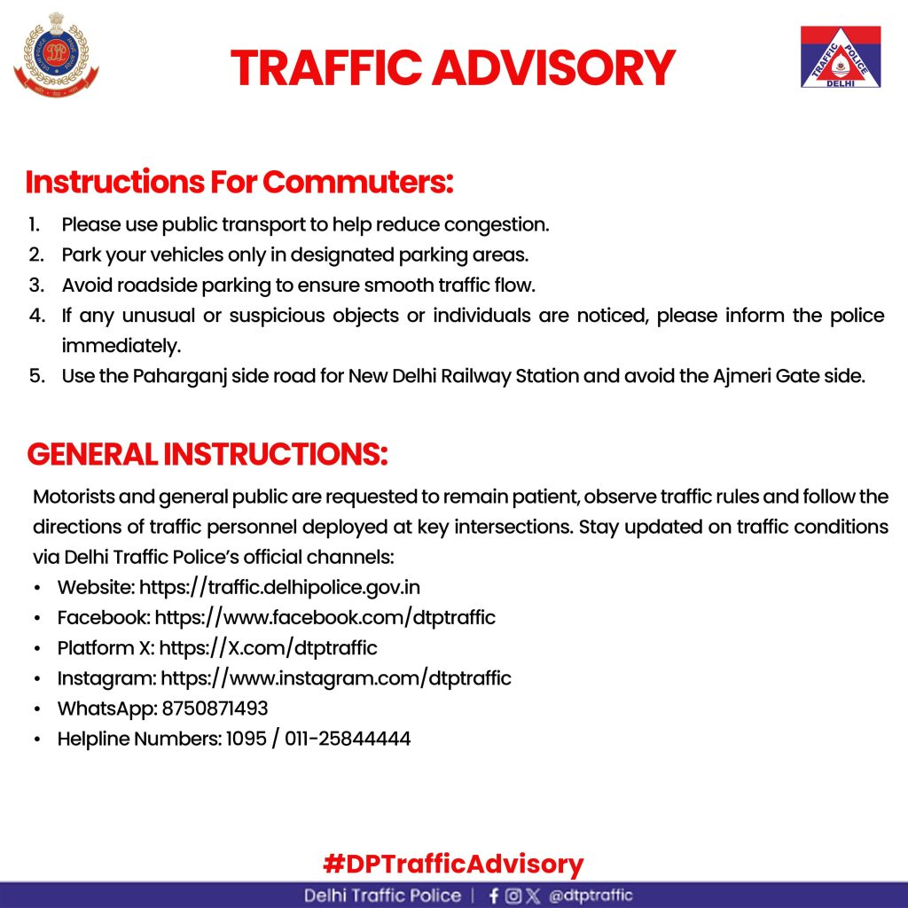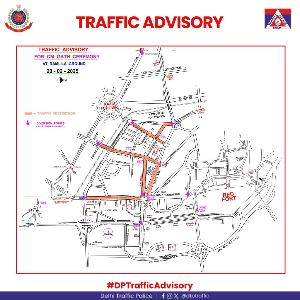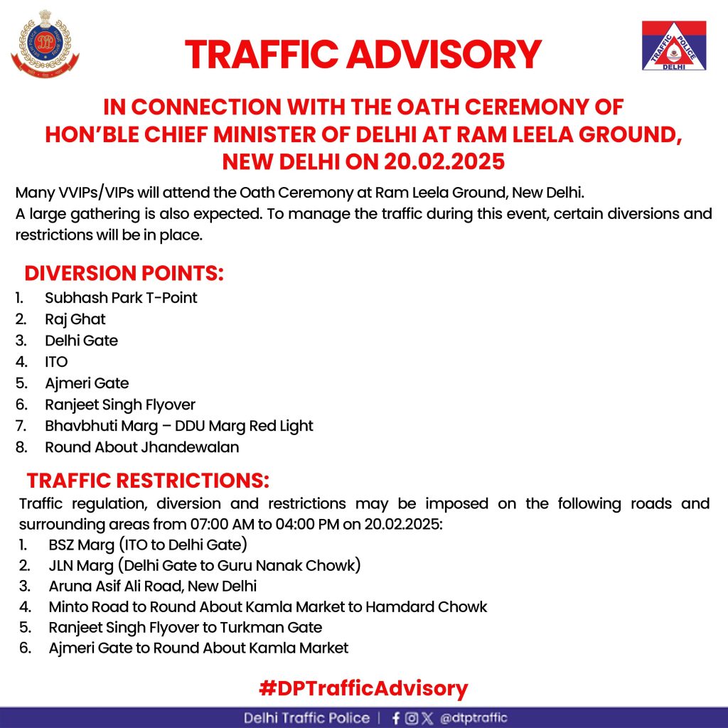 दिल्ली ट्रैफिक पुलिस ने एडवाइजरी में कहा “दिल्ली के मुख्यमंत्री के शपथ ग्रहण समारोह के मद्देनजर 20 फरवरी 2025 को कई रास्तों पर यातायात प्रतिबंधित रहेगा। सुबह 7 बजे से शाम के 4 बजे तक इन रास्तों पर आवाजाही पर रोक लगी रहेगी। नीचे दिए गिए निम्नलिखित रास्तों पर यातायात प्रतिबंध लागू रहेगा। दोपहर 12.35 बजे सीएम की शपथ होगी।