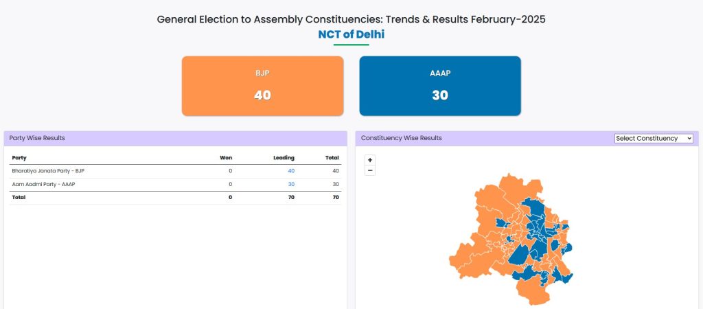दिल्ली विधानसभा चुनाव के लिए सुबह 8 बजे से मतगणना शुरू हुई। सबसे पहले पोस्टल बैलेट के मतों की गितनी हुई। इसके बाद ईवीएम मशीन के वोटों की काउंटिंग शुरू की गई। दिल्ली के शुरुआती रूझानों में बड़ा उलटफेर देखने को मिला। आम आदमी पार्टी को झटका लगा है। भारतीय जनता पार्टी ने बहुमत का आंकड़ा पार कर लिया। अरविंज केजरीवाल और मनीष सिसोदिया शुरू से पीछे चल रहे थे, हालांकि दो घंटे बाद दोनों नेताओं ने बढ़त बनाई है।