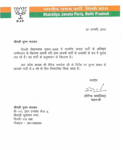 नोटिस में लिखा है कि दिल्ली विधानसभा चुनाव 2025 में भारतीय जनता पार्टी के अधिकृत उम्मीदवार के खिलाफ आपके पति आम आदमी पार्टी के प्रत्याशी के रूप में चुनाव लड़ रहे हैं। यह पार्टी के अनुशासन के खिलाफ है। ऐसे में दिल्ली बीजेपी प्रदेश अध्यक्ष वीरेंद्र सचदेवा के निर्देश पर तुरंत प्रभाव से आपको पार्टी से 6 साल के लिए निष्कासित किया जाता है।