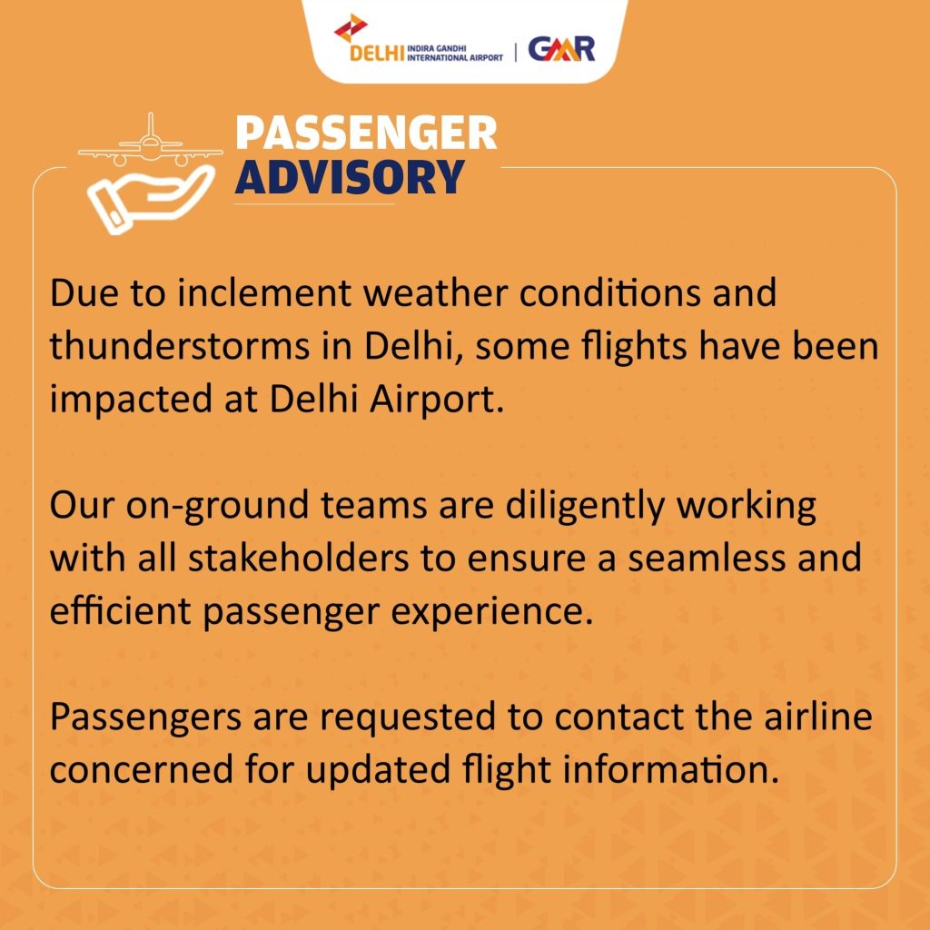 दिल्ली-एनसीआर में आए तेज आंधी-तूफान और भारी बारिश के चलते इंदिरा गांधी इंटरनेशनल एयरपोर्ट पर कई उड़ानों पर असर पड़ा है। मौसम की वजह से 40 से ज्यादा फ्लाइट्स को डाइवर्ट किया गया है जबकि 100 के आसपास फ्लाइट्स डिले हैं। इसे लेकर एयरपोर्ट प्रशासन ने यात्रियों के लिए एक विशेष एडवाइजरी जारी की है। एडवाइजरी में कहा गया है कि मौसम की खराब परिस्थितियों के कारण दिल्ली एयरपोर्ट पर कुछ फ्लाइट्स प्रभावित हुई हैं। यात्रियों से अनुरोध किया गया है कि वे अपने संबंधित एयरलाइन से संपर्क कर अपनी फ्लाइट अपडेट जानकारी प्राप्त करें।