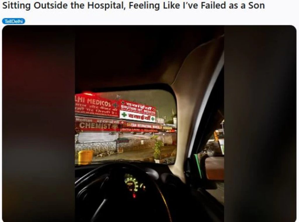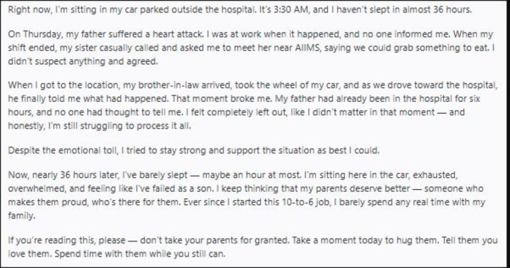 इस पोस्ट में शख्स ने बताया कि रात 3:30 बजे अस्पताल के बाहर अपनी कार में बैठा है और लगभग 36 घंटे से सोया नहीं है। उसके पिता को दिल का दौरा पड़ा था और वह हालात को संभालने की कोशिश करता है। उसे यह भी अफसोस है कि वह नौकरी के कारण परिवार से दूर हो गया है और माता-पिता के साथ समय नहीं बिता पाया।