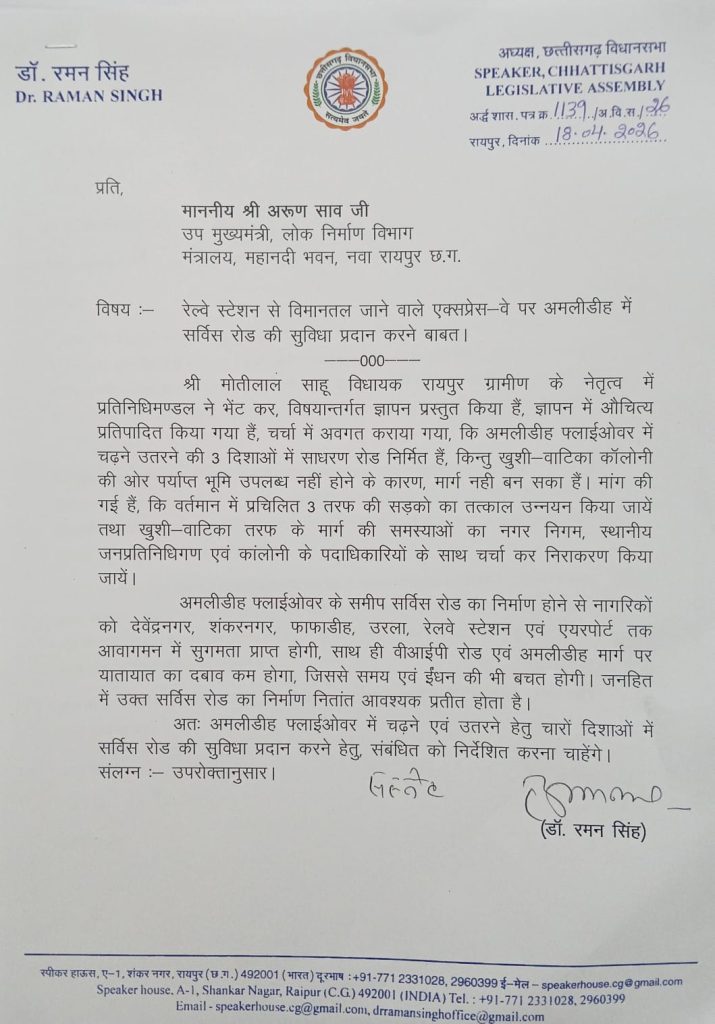 रायपुर। विधानसभा अध्यक्ष डॉ. रमन सिंह ने अमलीडीह फ्लाईओवर के पास सर्विस रोड निर्माण को लेकर पहल करते हुए उप मुख्यमंत्री अरुण साव को पत्र लिखा है और आवश्यक निर्देश जारी करने की मांग की है।