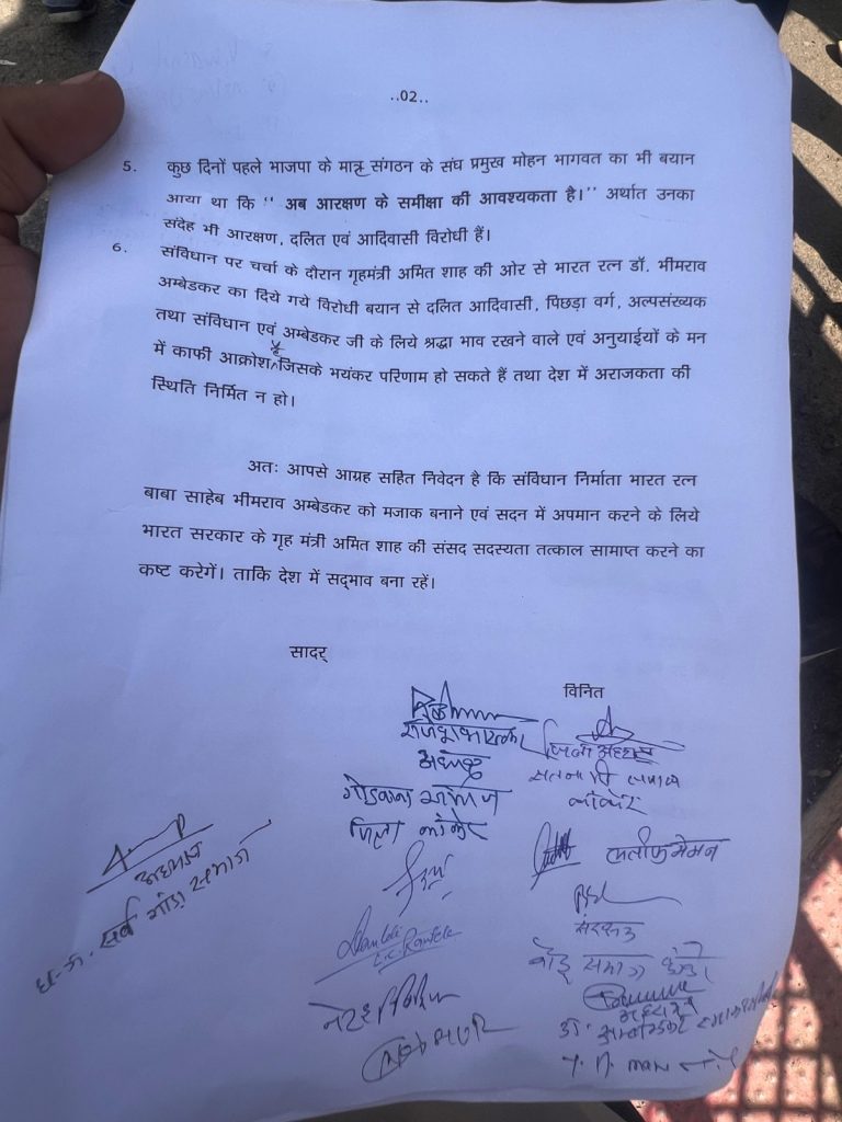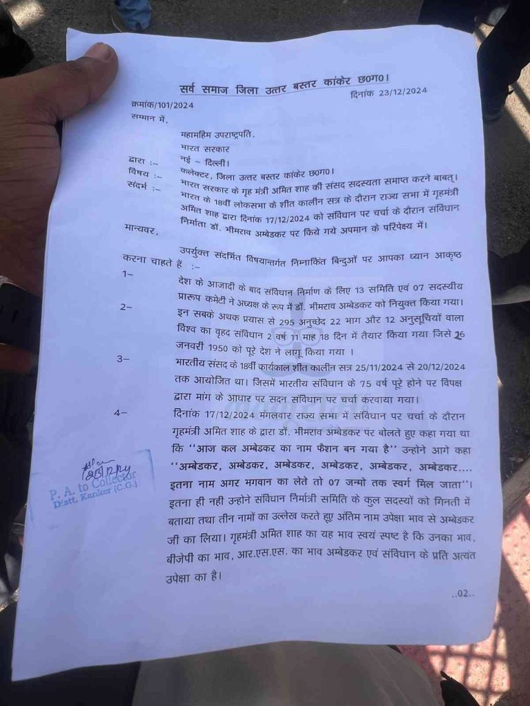 सुशील सलाम, कांकेर. राज्यसभा में केंद्रीय गृहमंत्री अमित शाह के आंबेडकर पर दिए बयान को लेकर कई जगहों पर विरोध जारी है. अब उनके संसद सदस्यता समाप्त करने की मांग उठी है. दरअसल, सर्व समाज संगठन ने उपराष्ट्रपति जगदीप धनखड़ को पत्र लिखा है. जिसमें उन्होंने केंद्रीय गृहमंत्री अमित शाह की संसद सदस्यता समाप्त करने की मांग की है.