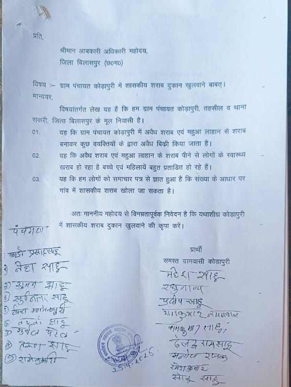 विधायक धर्मजीत सिंह को कोड़ापुरी के ग्रामीणों ने बताया कि ग्राम पंचायत कोड़ापुरी शराब विहीन क्षेत्र है, जिसके कारण परेशानी होती है. शराब लेने 20 किलोमीटर का सफर तय करके शहर जाना पड़ता है. इस मामले में आबकारी निरीक्षक कल्पना राठौर ने बताया कि ग्रामीणों की मांग को लेकर प्रस्ताव शासन को भेजा गया है. जल्द ही उनके मांग का निराकरण किया जाएगा.