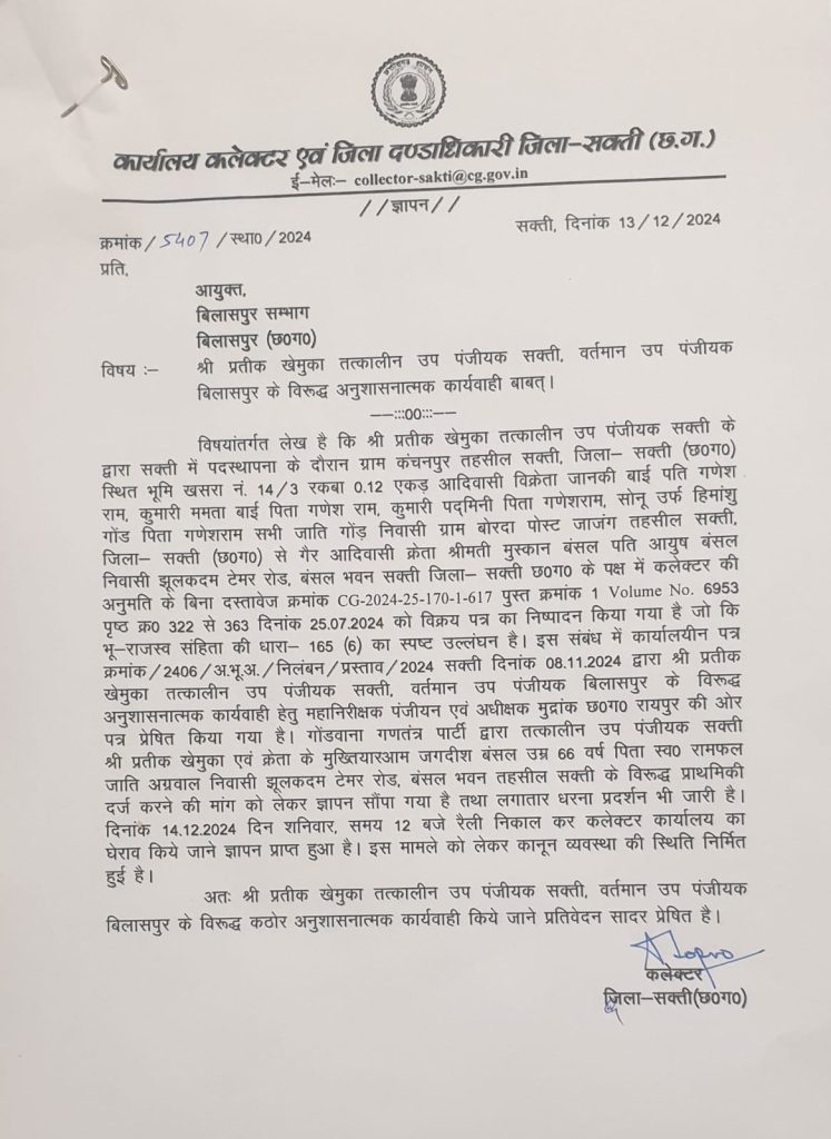 प्रतीक चौहान. रायपुर. बिलासपुर संभाग के संभाग आयुक्त महादेव कावरे ने सक्ती के तत्कालीन उप पंजीयक एवं वर्तमान बिलासपुर उप पंजीयक प्रतीक खेमुका को निलंबित कर दिया है. उप पंजीयक संघ का दावा है कि प्रतीक खेमुका की गलती सिर्फ इतनी थी कि उन्होंने कलेक्टर के आदेश का पालन करते हुए रजिस्ट्री की. एक आदिवासी Diverted भूमि के रजिस्ट्री के अनुमति के लिए कलेक्टर के पास आवेदन लगाया गया था, कलेक्टर ने यह लिखकर आवेदन खारिज कर दिया कि “डायवर्टेड भूमि के मामले में अनुमति की जरूरत नहीं होती है. डायवर्टेड भूमि के मामले में 165 (6) लागू नहीं होता है.”