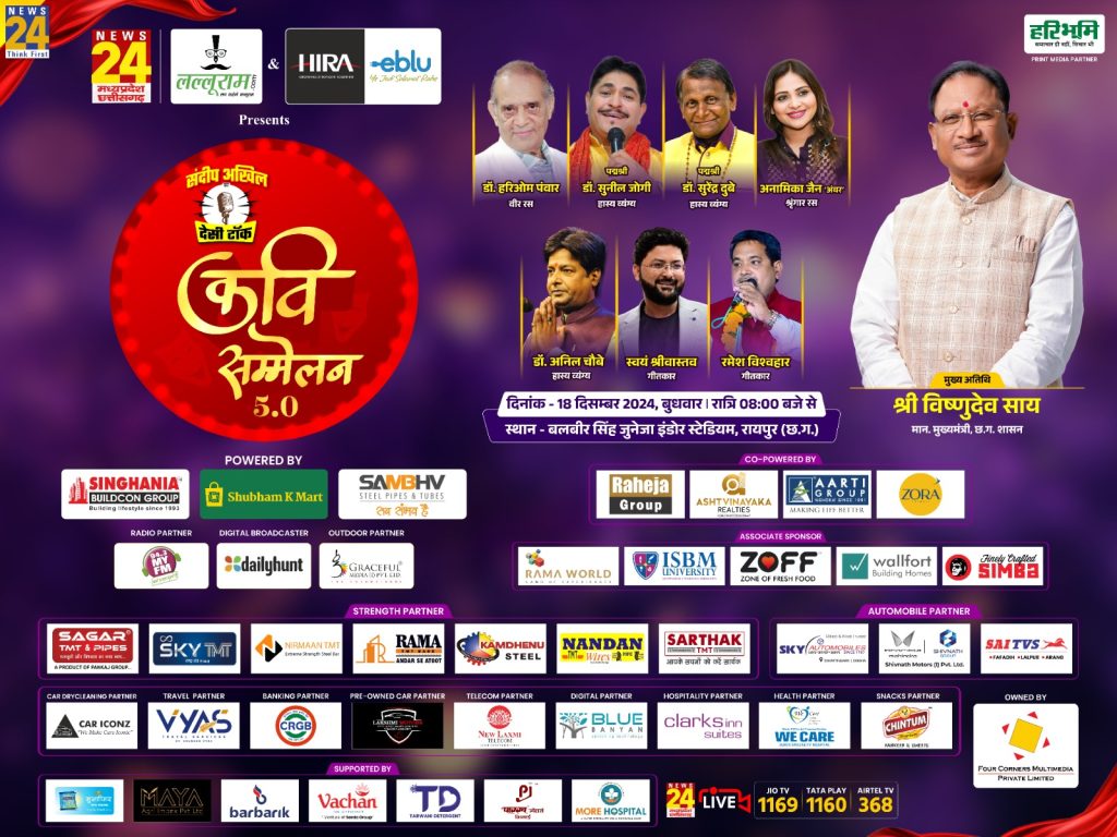 रायपुर. NEWS 24 MP/CG और लल्लूराम डॉट कॉम की ओर से प्रदेश में अपनी एक अलग पहचान बना चुके ‘देसी टॉक कवि सम्मेलन’ का एक बार फिर से आयोजन किया जा रहा है. यह आयोजन राजधानी रायपुर के इंडोर स्टेडियम में 18 दिसंबर को आयोजित किया जाएगा. इस आयोजन के टाइटल स्पॉन्सर हीरा ग्रुप (eblu) हैं. साथ ही पावर्ड बाय में सिंघानिया बिल्डकॉन, शुभम के मार्ट और संभव स्टील पाइप्स एंड ट्यूब्स हैं. इस कार्यक्रम में डिजिटल पार्टनर डेली हंट है.